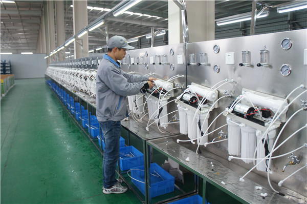 據(jù)悉,新車間配備國內(nèi)先進(jìn)的凈水機(jī)自動化生產(chǎn)線,采用可編程控制器(PLC),實(shí)現(xiàn)自動、轉(zhuǎn)向、垂直升降輸送;自動倍速鏈輸送,節(jié)拍控制,大幅提高了生產(chǎn)效率。專業(yè)化檢測線以304不銹鋼為材質(zhì),配備壓力表、漏電開關(guān)、插座、氣管及其他相關(guān)儀表,確保產(chǎn)品品質(zhì)優(yōu)良。