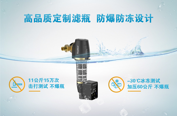 對于傳統前置過濾器來說一直存在一個隱患,那就是在低溫冰凍或是高壓水錘等情況下,容易引發濾瓶爆裂,令許多用戶頭疼不已。其實,回歸根本來說,還是因為濾瓶材質不佳。榮事達為攻克這一難題,可謂是下足功夫。智能前置過濾器濾瓶采用獨特配方和原裝進口材料,不含雙酚A,濾瓶無注塑點,并通過NSF、SGS檢測,經過改性配方與防爆防凍極限抗壓測試,11公斤15萬次擊打不爆瓶,-30℃冰凍測試加壓60公斤不爆瓶,濾瓶綜合性能有著質的飛躍,保證用戶使用安心。