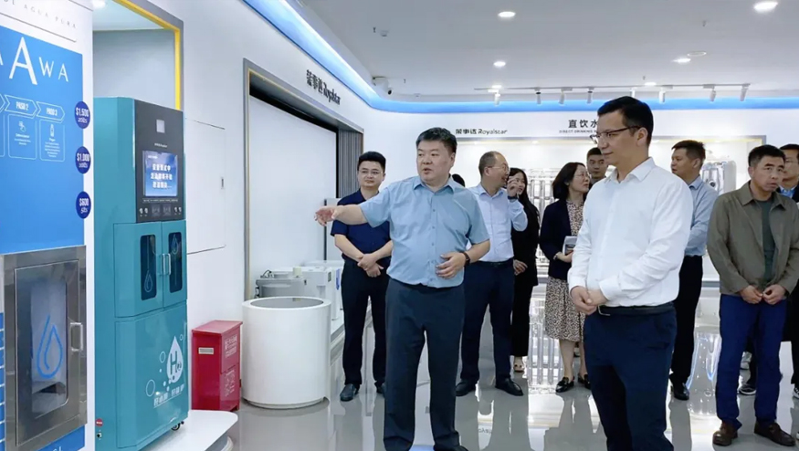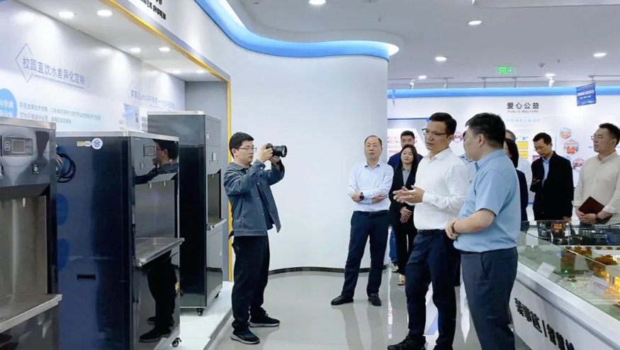 總經理王悅生向領導一行介紹管道直飲水項目:該項目針對社區、學校、醫院、企事業單位及工廠等場景,提供定制化飲水模式,涵蓋社區智慧水站、校園智慧凈水屋、高端直飲水設備及變頻供回水系統,旨在為民眾打造便捷、高端、健康的飲水服務。